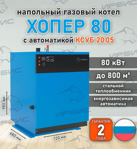 Напольный газовый котел «Хопер 80» с автоматикой КСУБ 20.05 предназначен для водяного отопления жилых, промышленных, складских и прочих помещений площадью до 800 м².